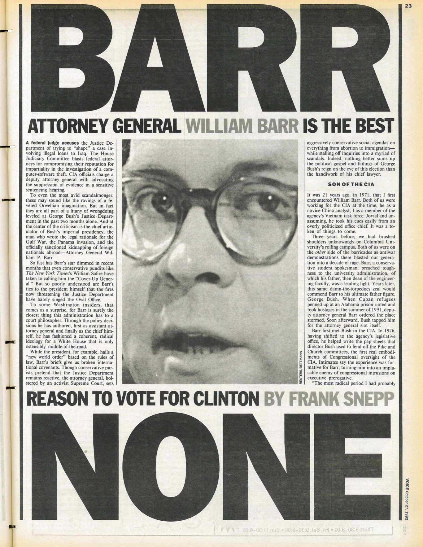 Barr was 41 when he took over the nation’s top law job. During the modern era, only a President’s brother and the son of a Supreme Court justice managed to assume the nation’s top law post when that young. Barr, a bookish-looking son of educators who speaks with a muted New York accent, brought no special credentials. He earned bachelor’s and master’s degrees in Chinese studies and picked up his law degree at night school while working at the CIA.