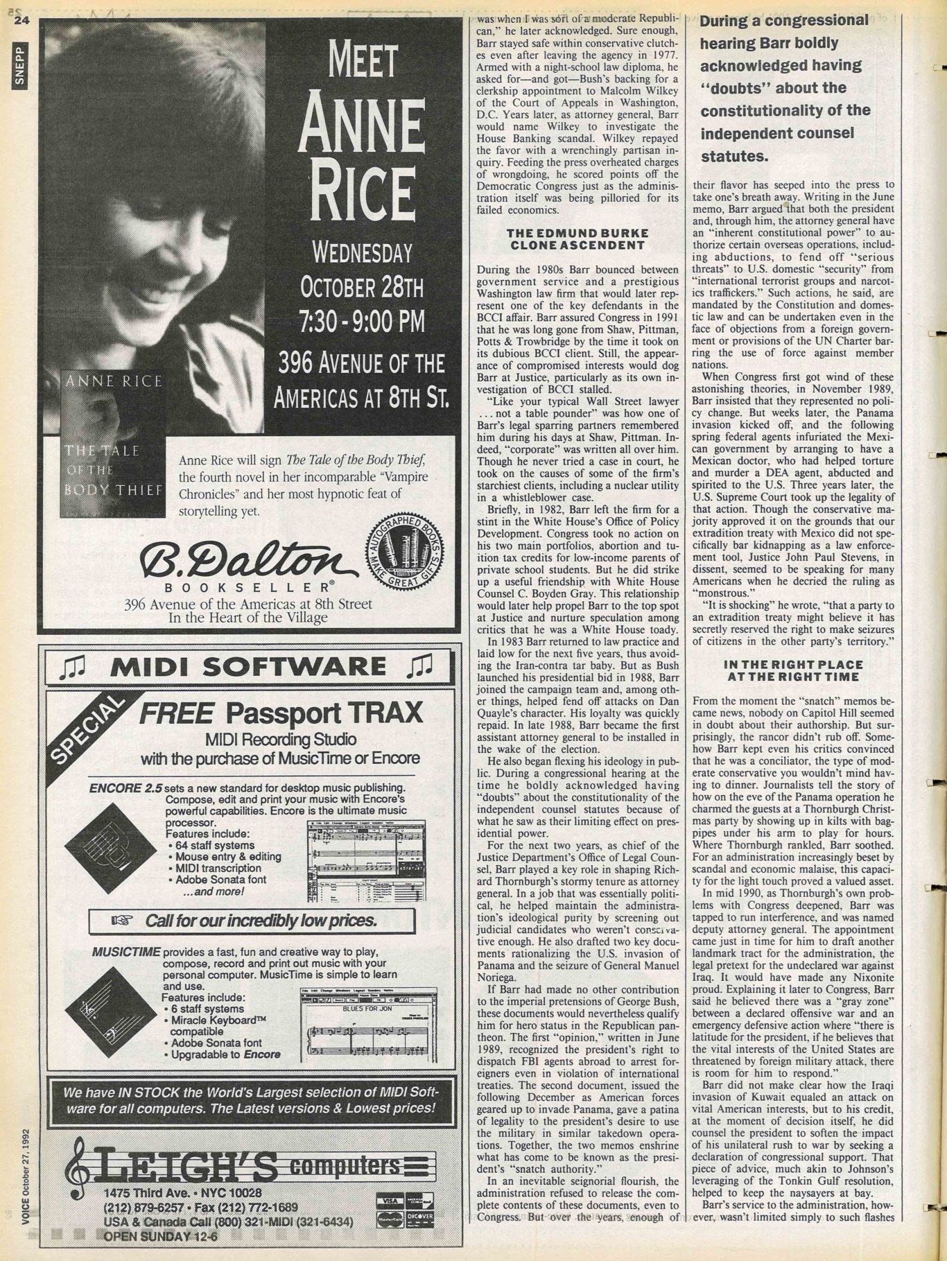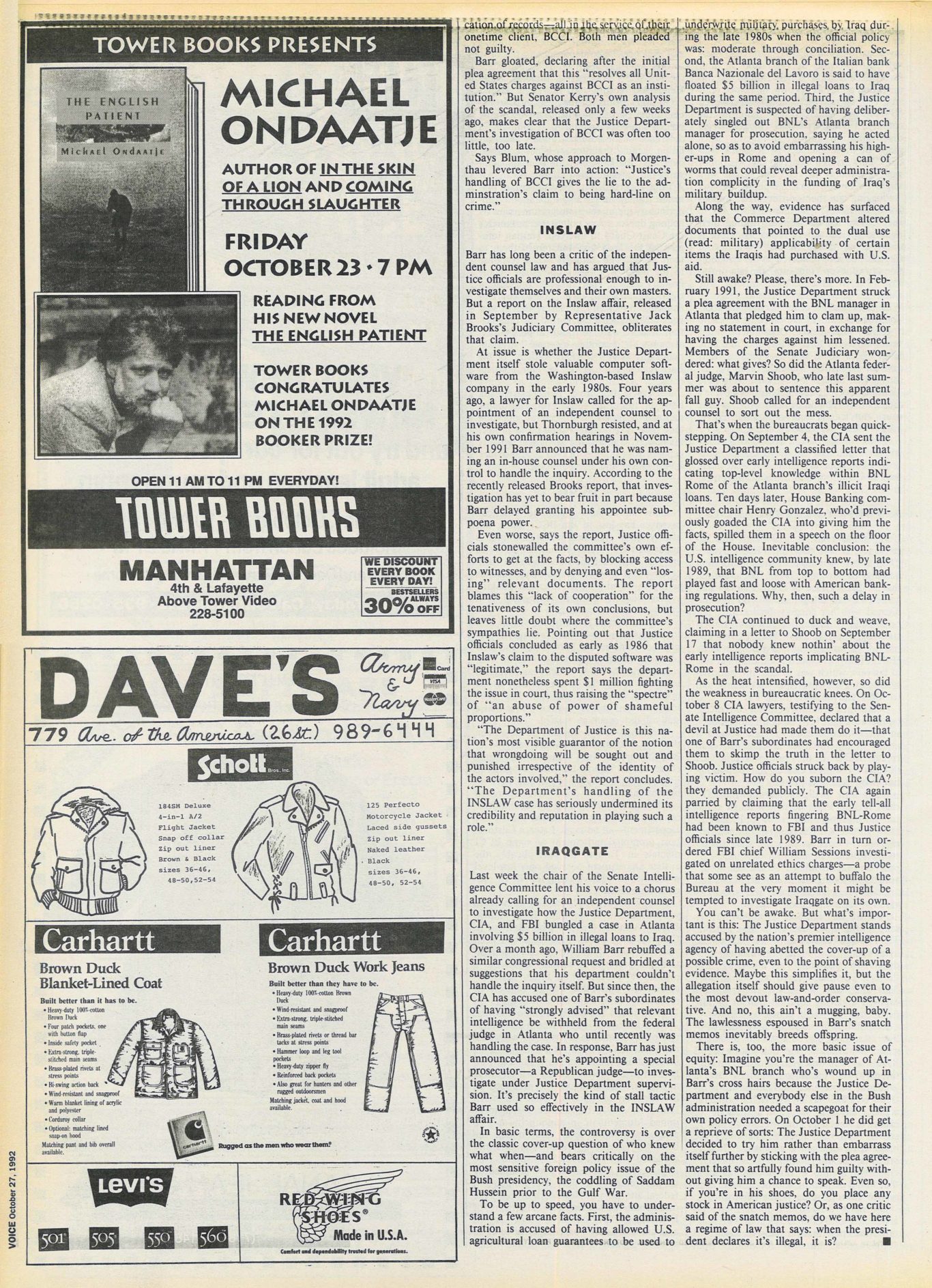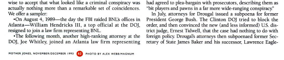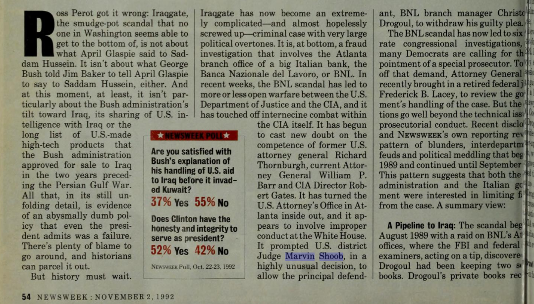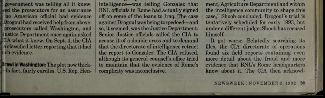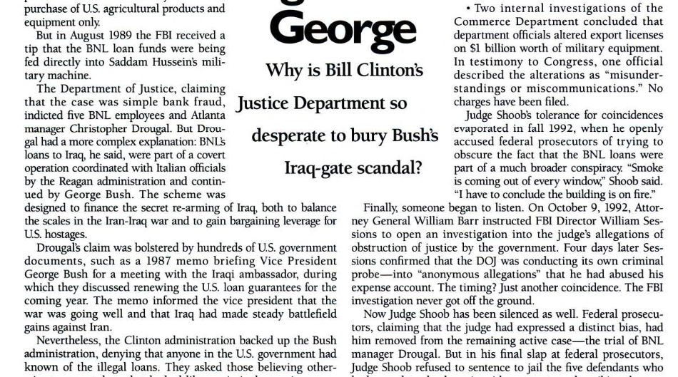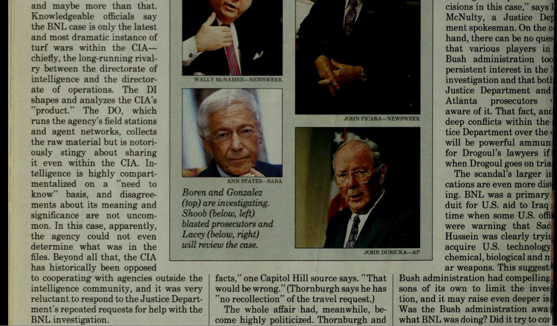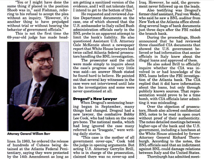 Last year President Bush’s Attorney General, William Barr, declining to have an independent counsel investigate it, declared that Justice had handled it correctly. In effect, the Bush people insisted that branch-bank small fry had engineered the Iraq loan on their own and that Bush Administration heavyweights had not conspired with Italy to arm Iraq before the Persian Gulf war.