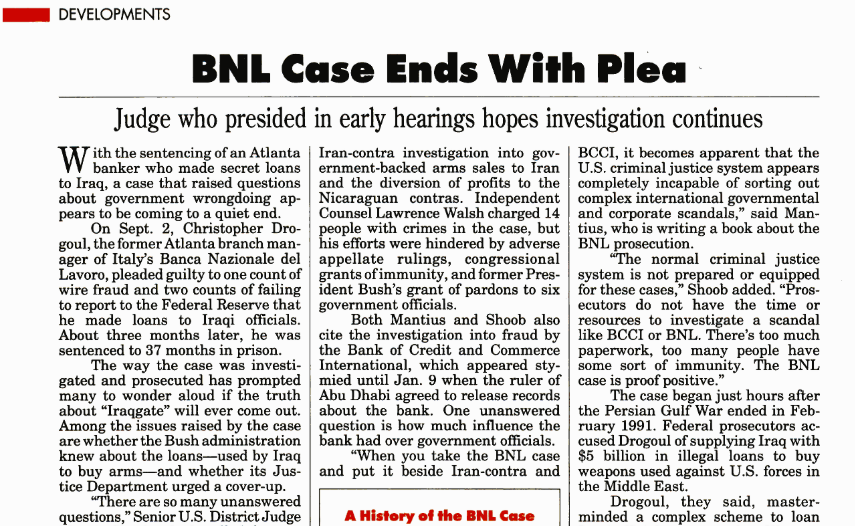 The Government’s story, which may be a lie, is that the scheme to make illegal loans of $5 billion to Iraq was the work of five branch-bank employees in Atlanta. They worked for the Atlanta branch of Italy’s Banca Nazionale del Lavoro with headquarters in Rome, and the deed was done back during the Bush Administration when Washington still thought Saddam Hussein was one of the good guys.