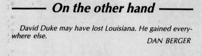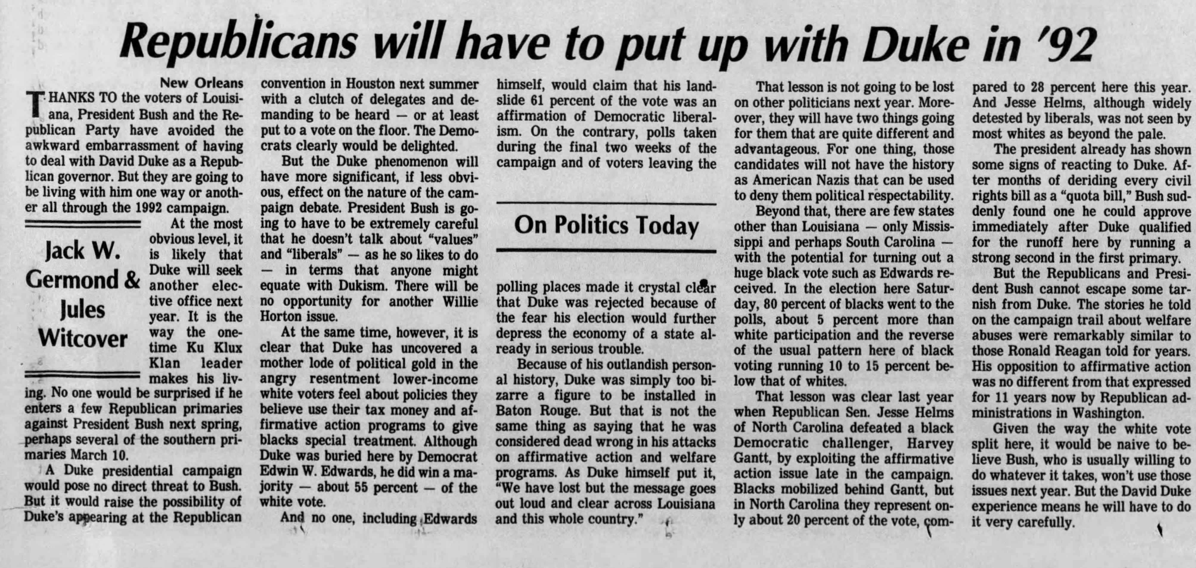 “Thanks to the voters of Louisiana, President Bush and the Republican Party have avoided the awkward embarrassment of having to deal with David Duke as a Republican governor… at the same time, however, it is clear that Duke has uncovered a mother lode of political gold in the angry resentment lower-income white voters feel about policies they believe use their tax money and affirmative action programs to give blacks special treatment. Although Duke was buried here… he did win a majority — about 55 percent — of the white vote.”