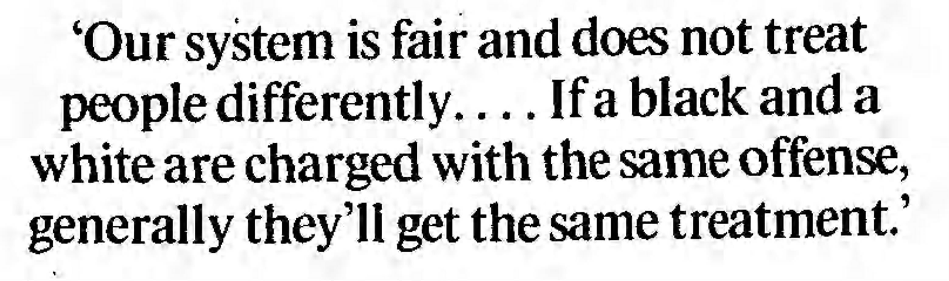 “I’m saying, taken in its totality, the system seems to operate fairly. We should be vigilant and look for potential discrimination, and you can always make improvements in the system. But the empirical studies I see suggest that people are treated equally in the system. That is, if a black and a white are charged with the same offense, generally they will get the same treatment in the system, and ultimately the same penalty.”