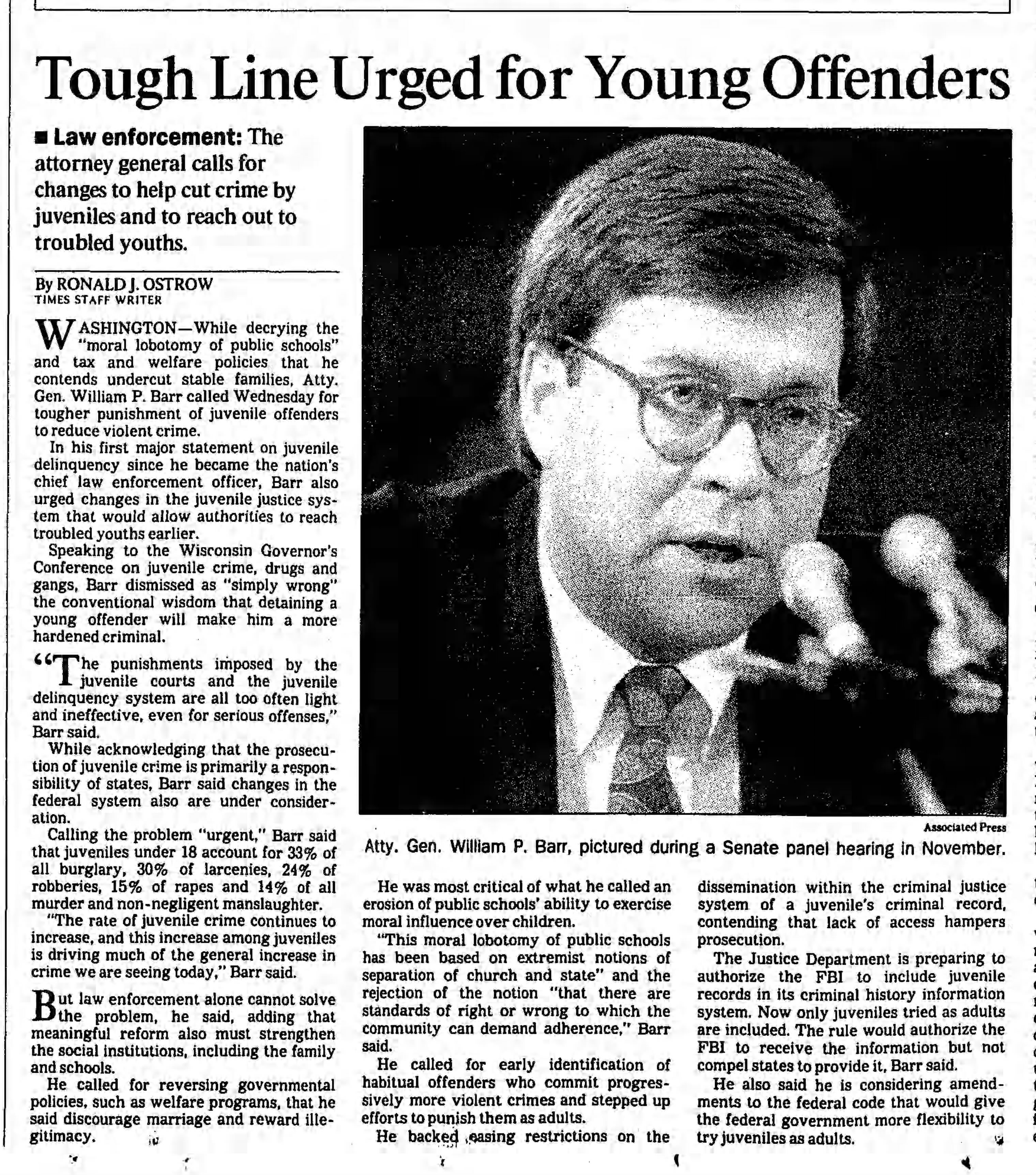 WASHINGTON — While decrying the “moral lobotomy of public schools” and tax and welfare policies that he contends undercut stable families, Atty. Gen. William P. Barr called Wednesday for tougher punishment of juvenile offenders to reduce violent crime…