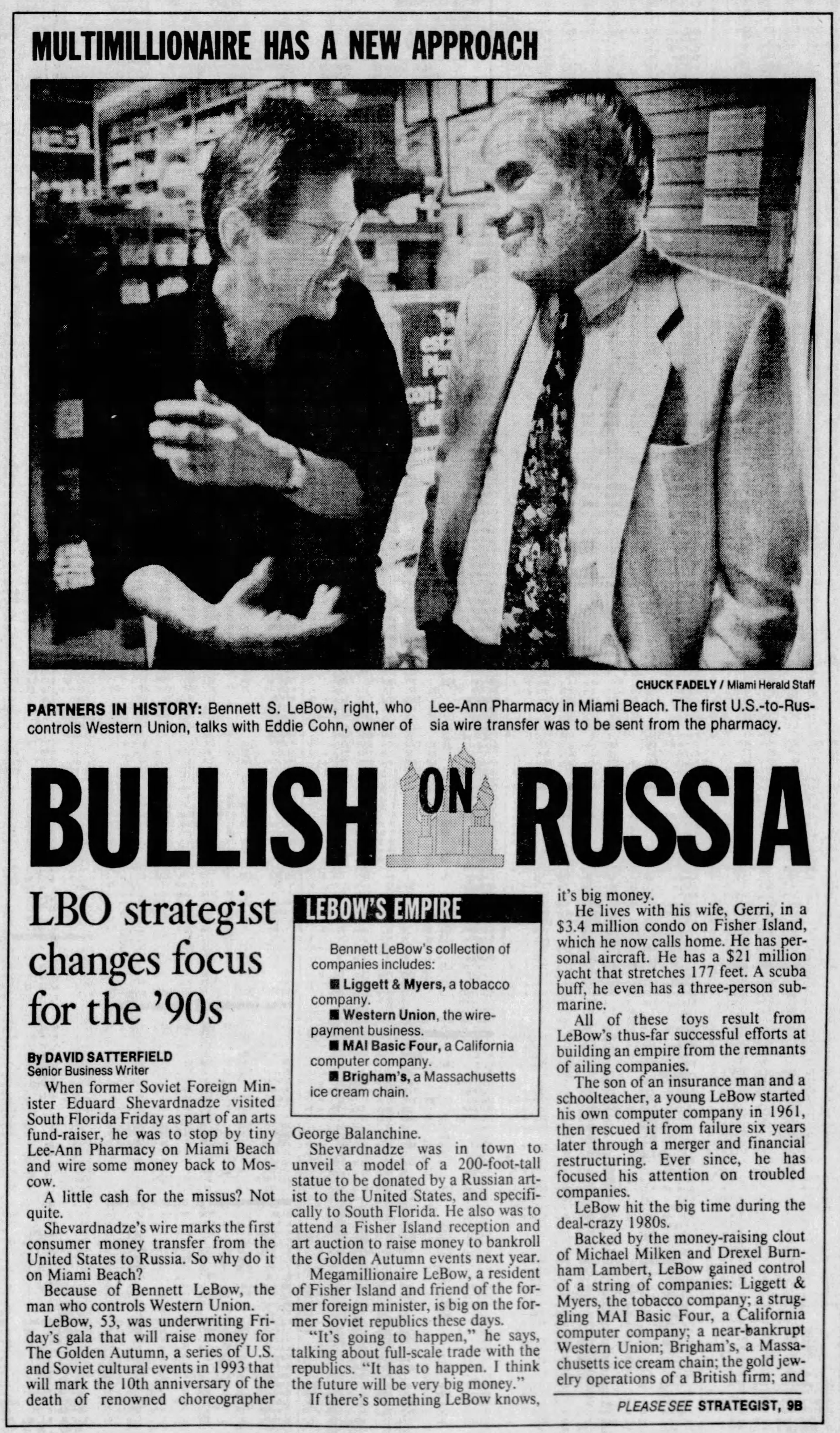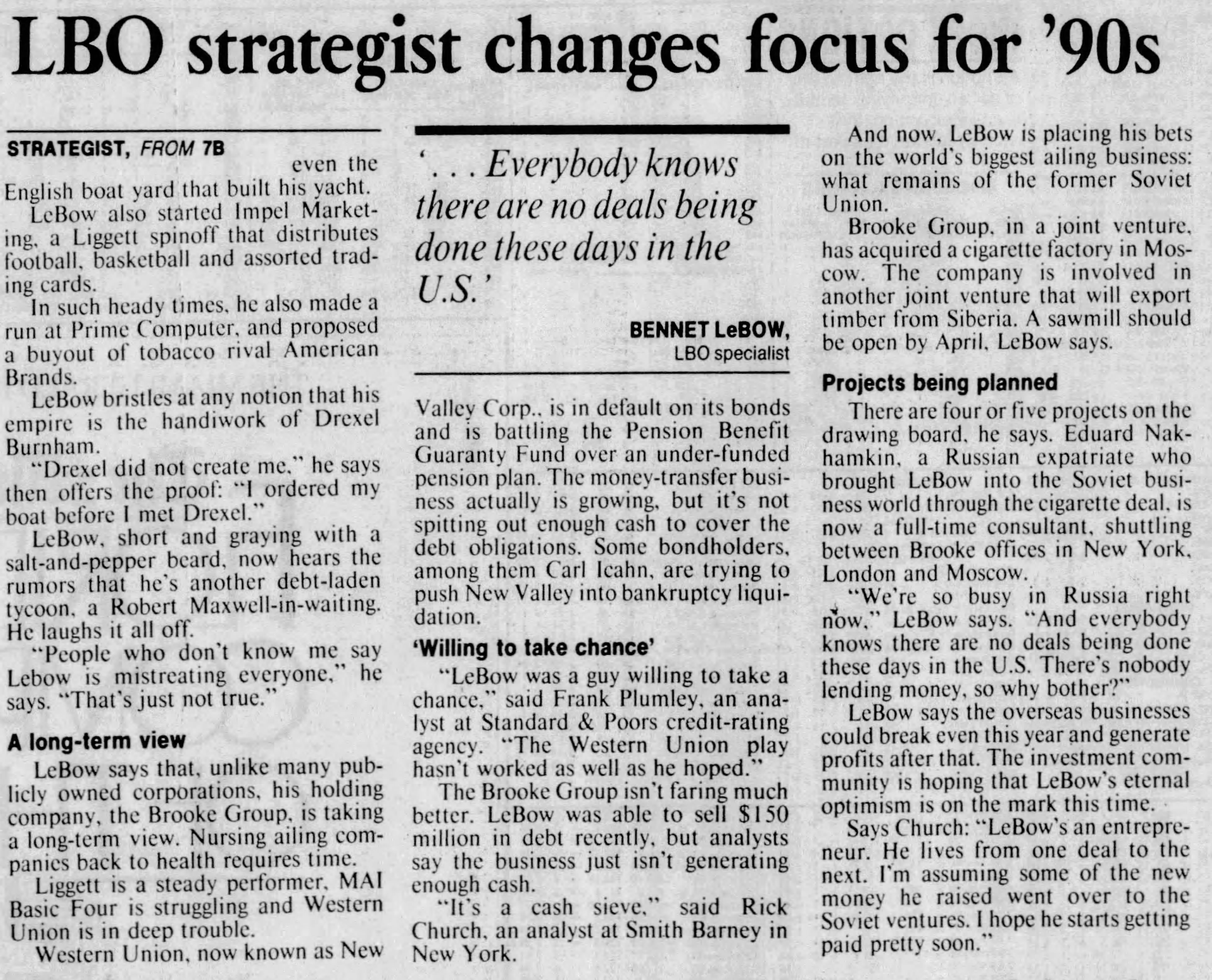 Says Church: “LeBow’s an entrepreneur. He lives from one deal to the next. I’m assuming some of the money he raised went over to the Soviet ventures. I hope he starts getting paid pretty soon.”