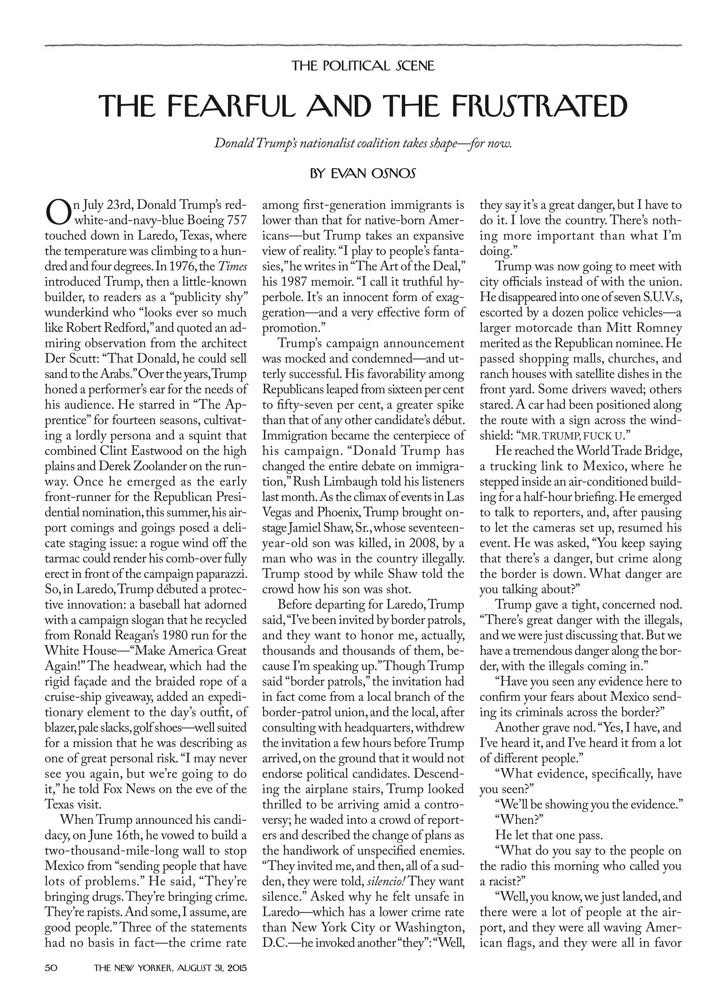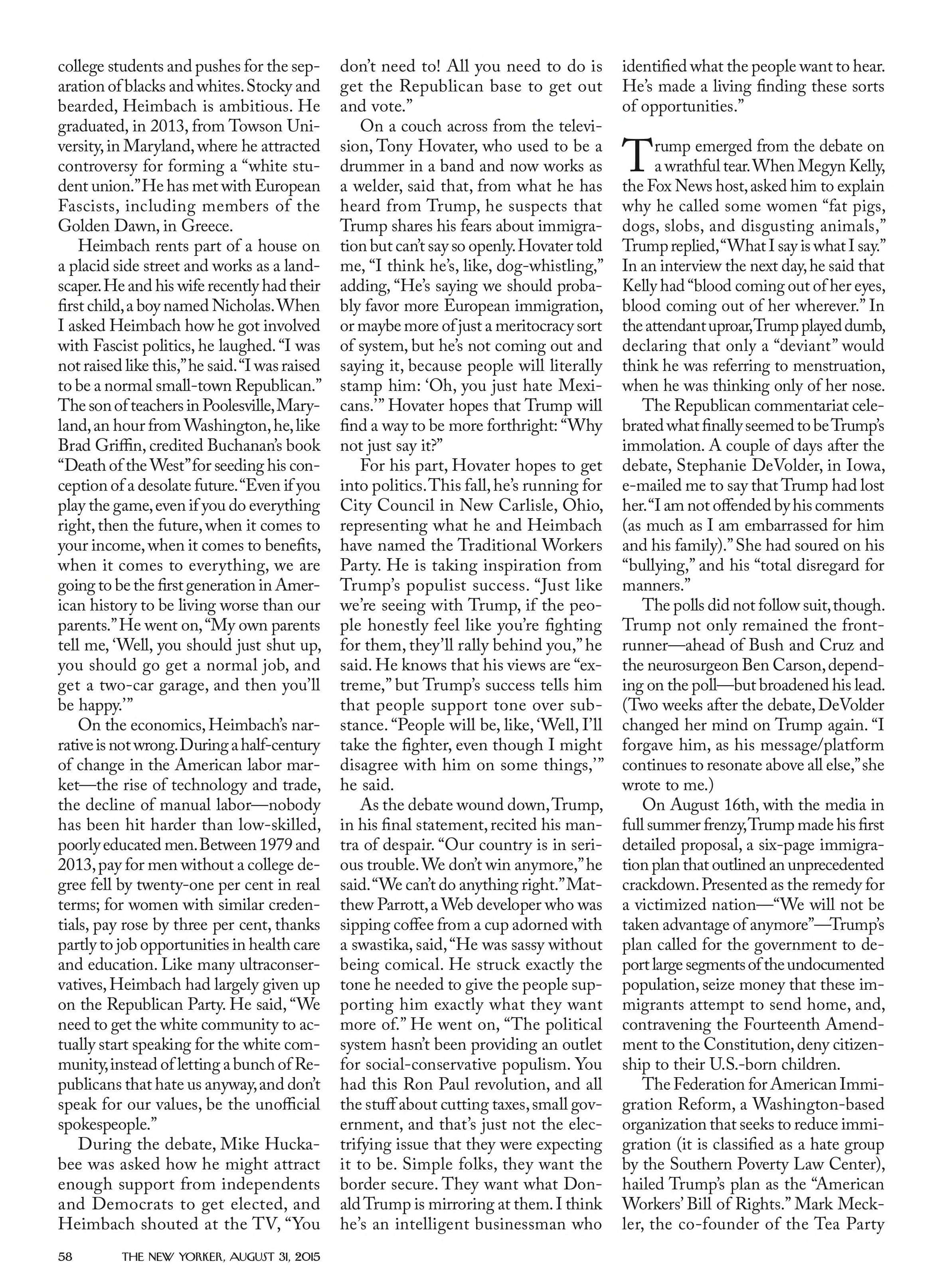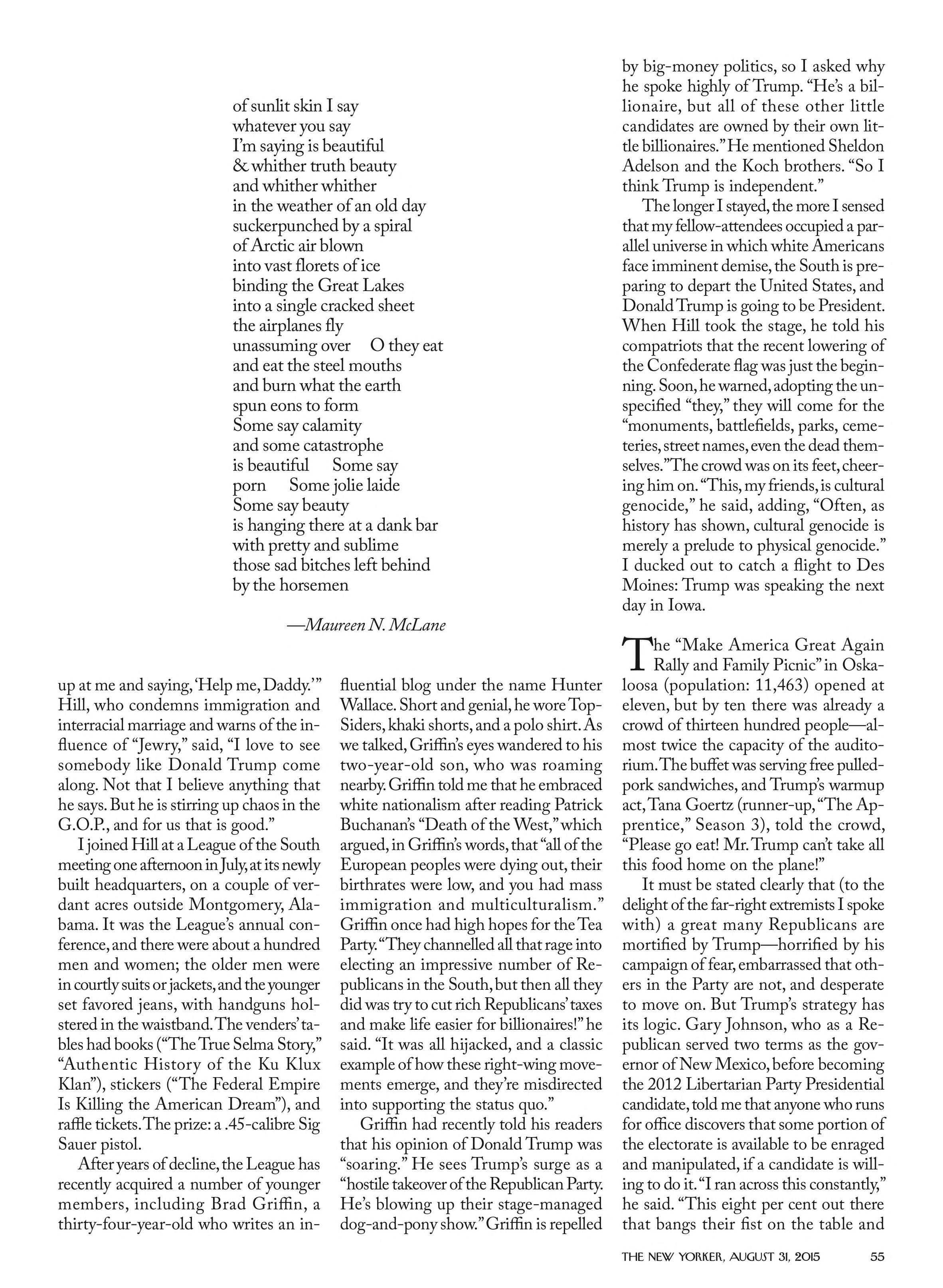 “The ‘Make America Great Again Rally and Family Picnic’ in Oskaloosa (population: 11,463) opened at eleven, but by ten there was already a crowd of thirteen hundred people — almost twice the capacity of the auditorium. The buffet was serving free pulled-pork sandwiches, and Trump’s warmup act, Tana Goertz (runner-up, ‘The Apprentice,’ Season 3), told the crowd, ‘Please go eat! Mr. Trump can’t take all this food home on the plane!'”