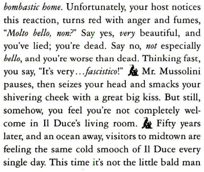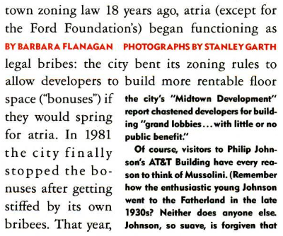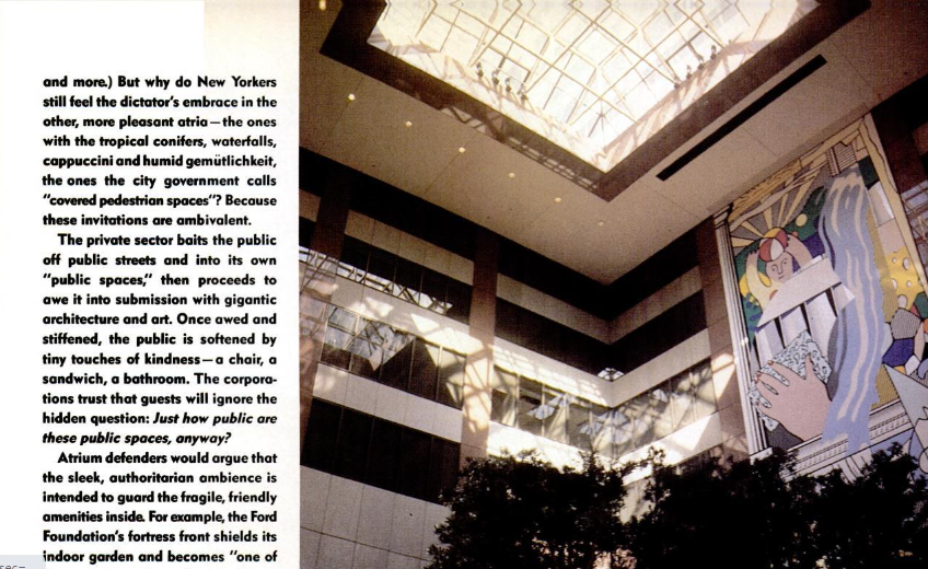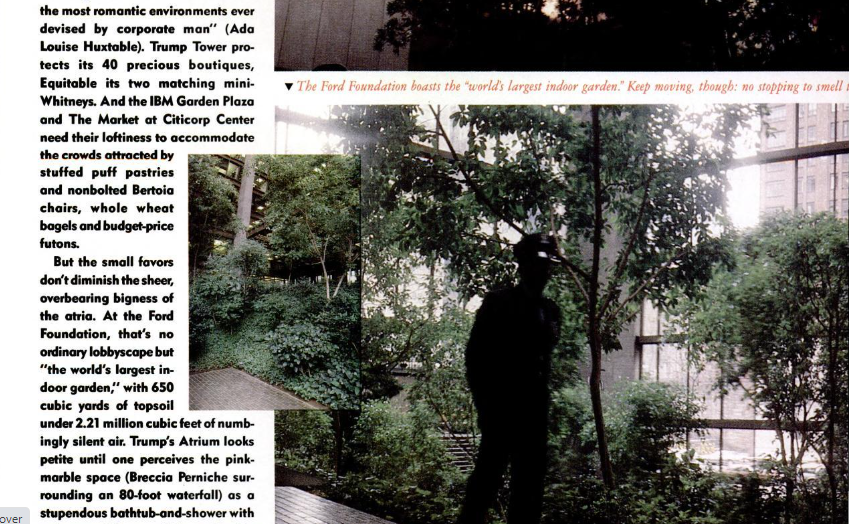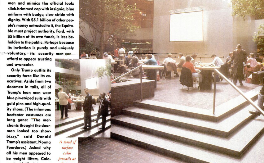 “Barbara Flanagan and photographer Stanley Garth reveal how our pseudo-public spaces, such as The Trump Tower Atrium, are uptight fiefdoms guarded by private armies, Mussolini-style. (Now, if we could only hang Trump from a meat hook…)”
