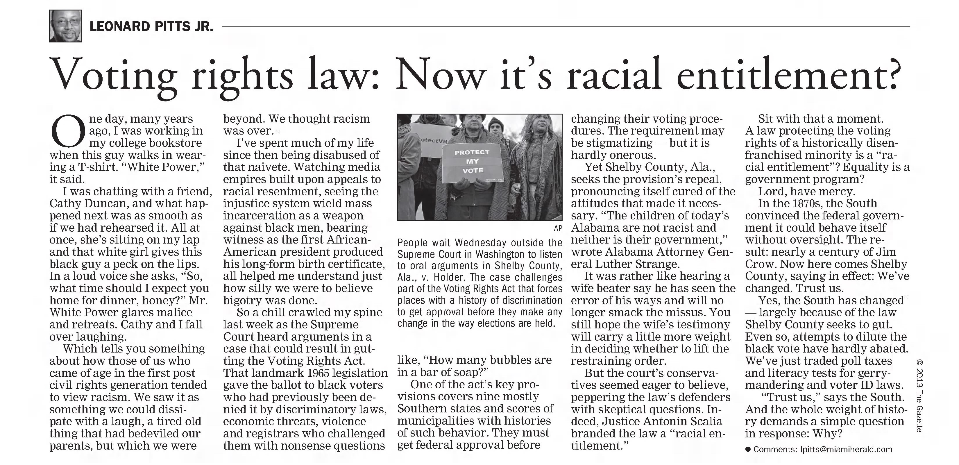 March 3, 2013 — Voting Rights Act: now it’s a racial entitlement? by Leonard Pitts Jr.