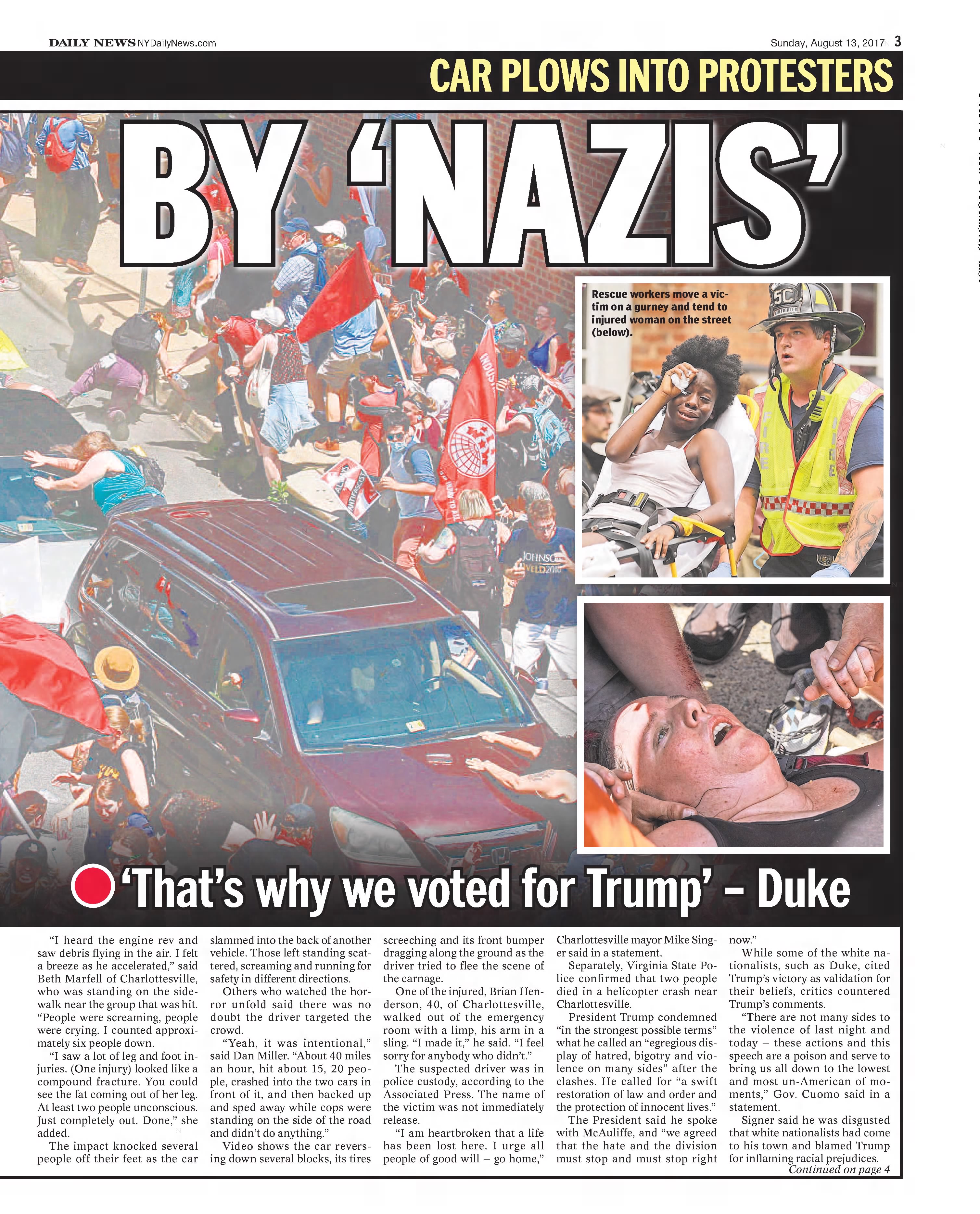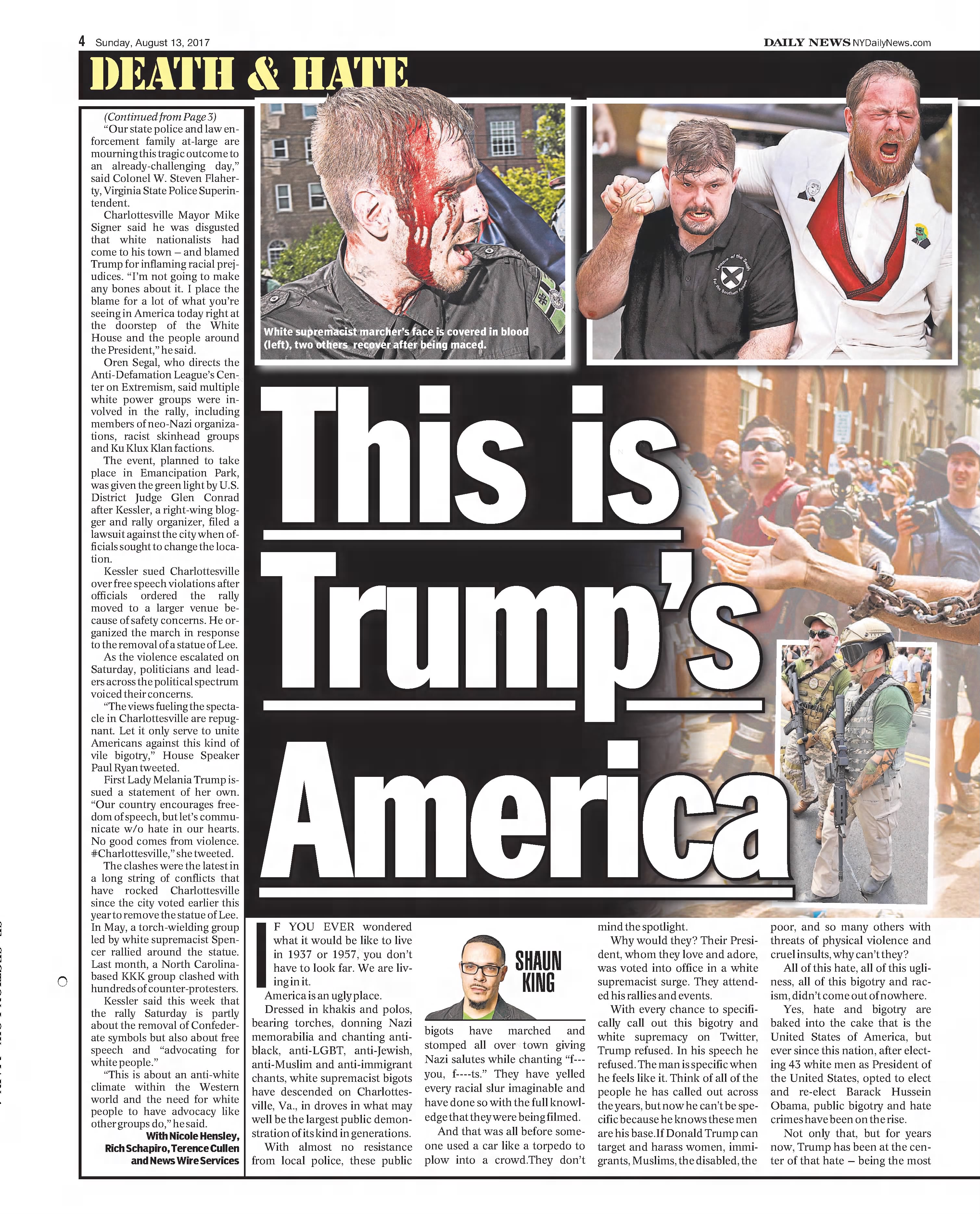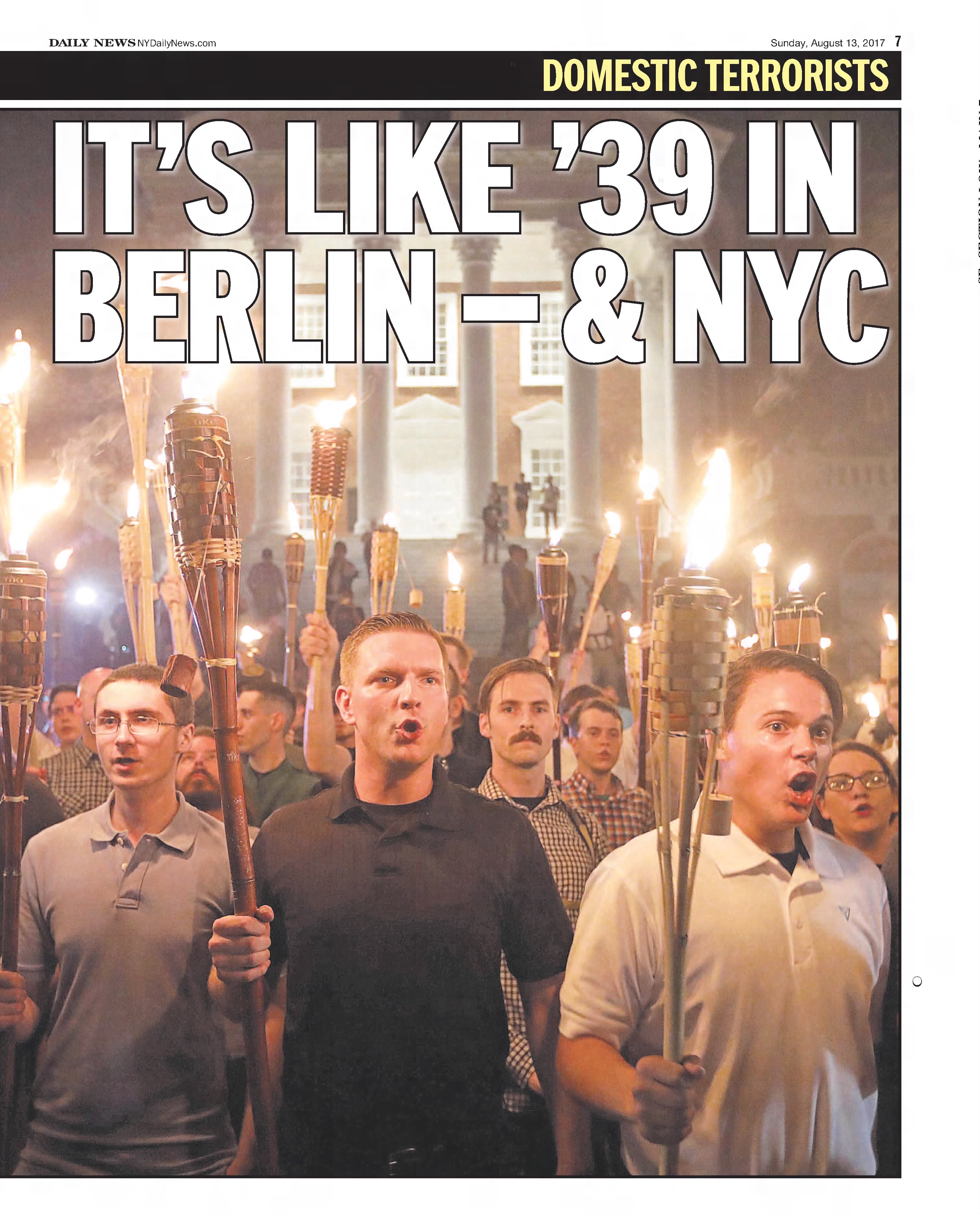 -Excerpt courtesy of the New York Daily News, “This is Trump’s America: 80 years after Hitler, simmering hate erupts,” by Mike Lupica, August 13, 2017