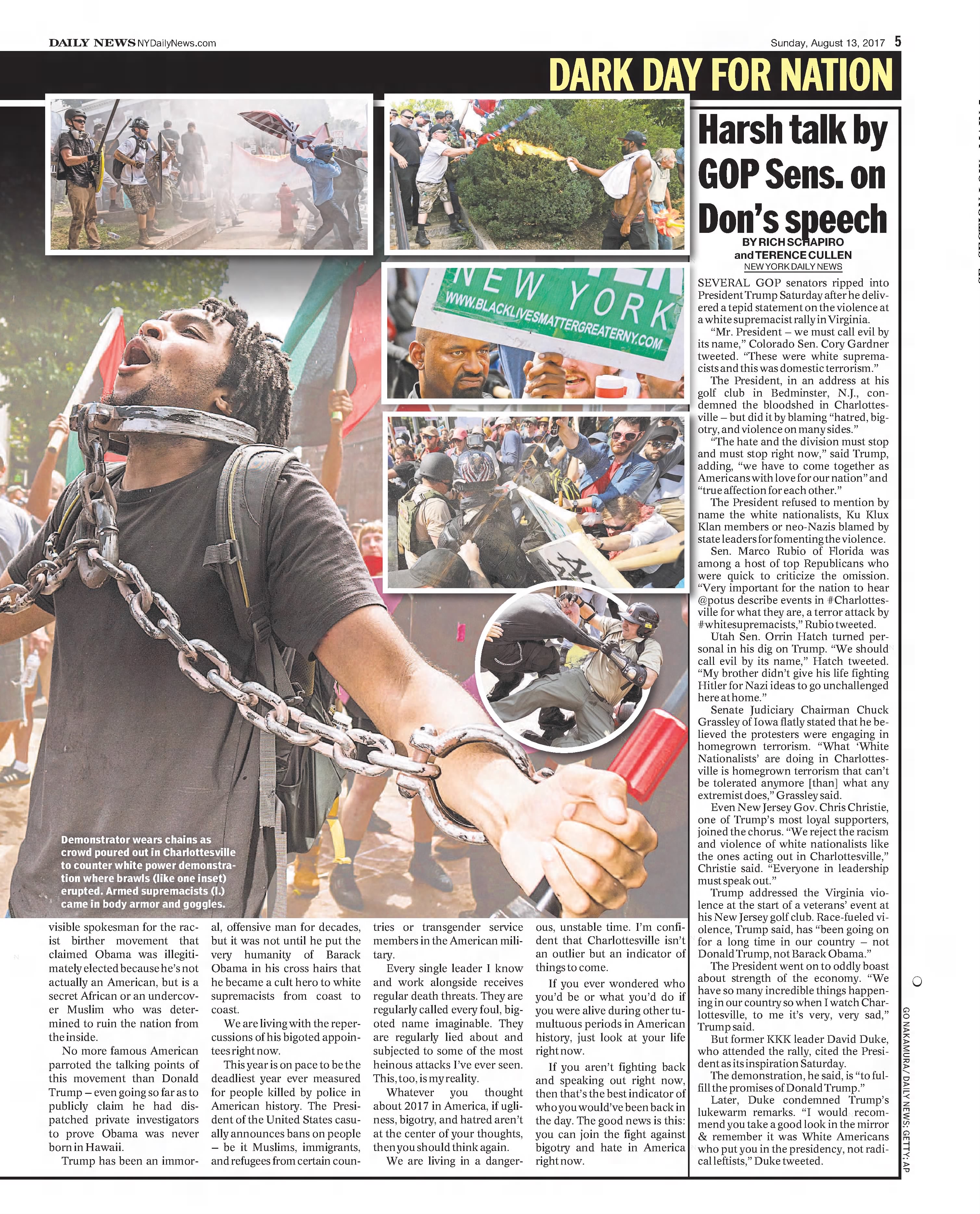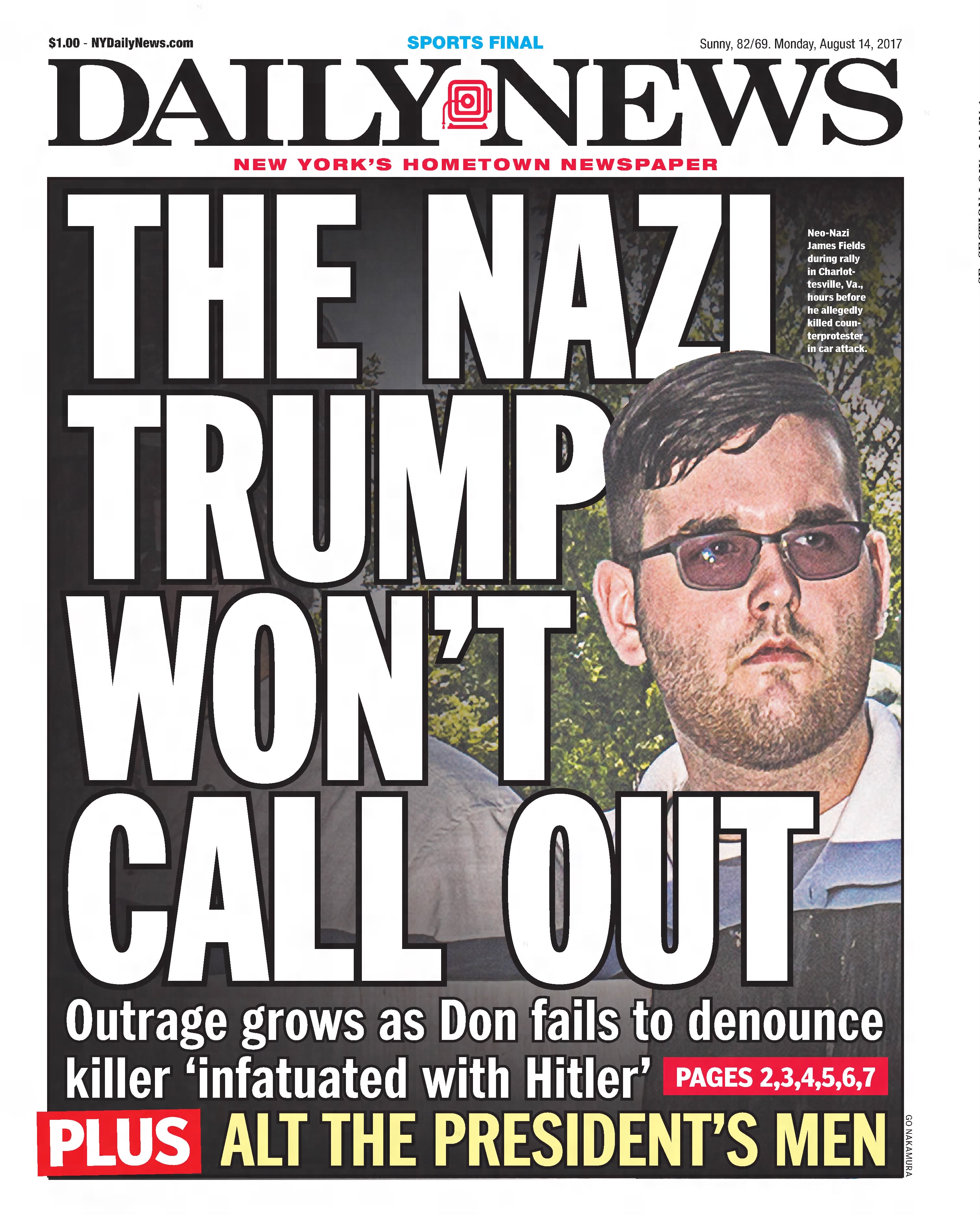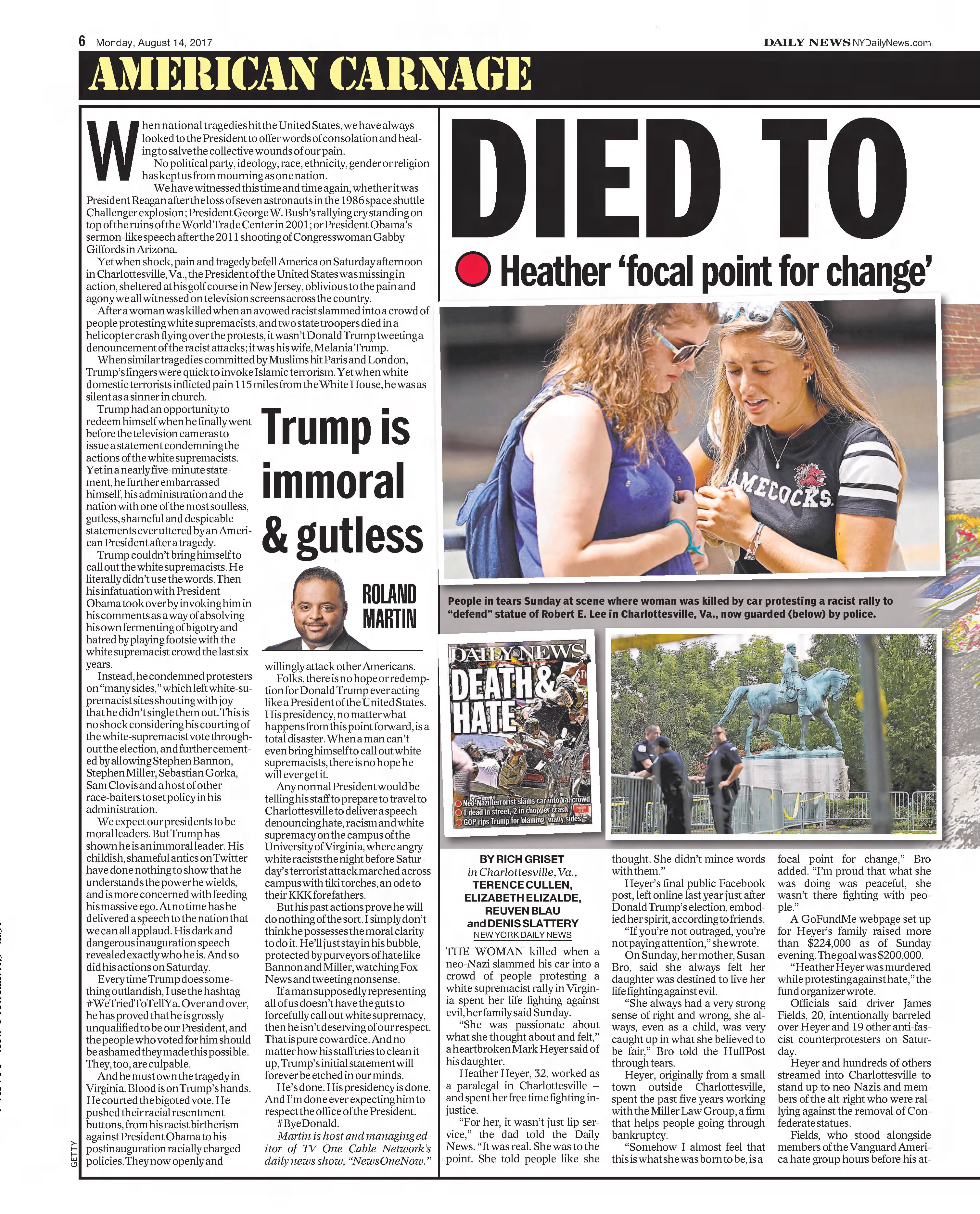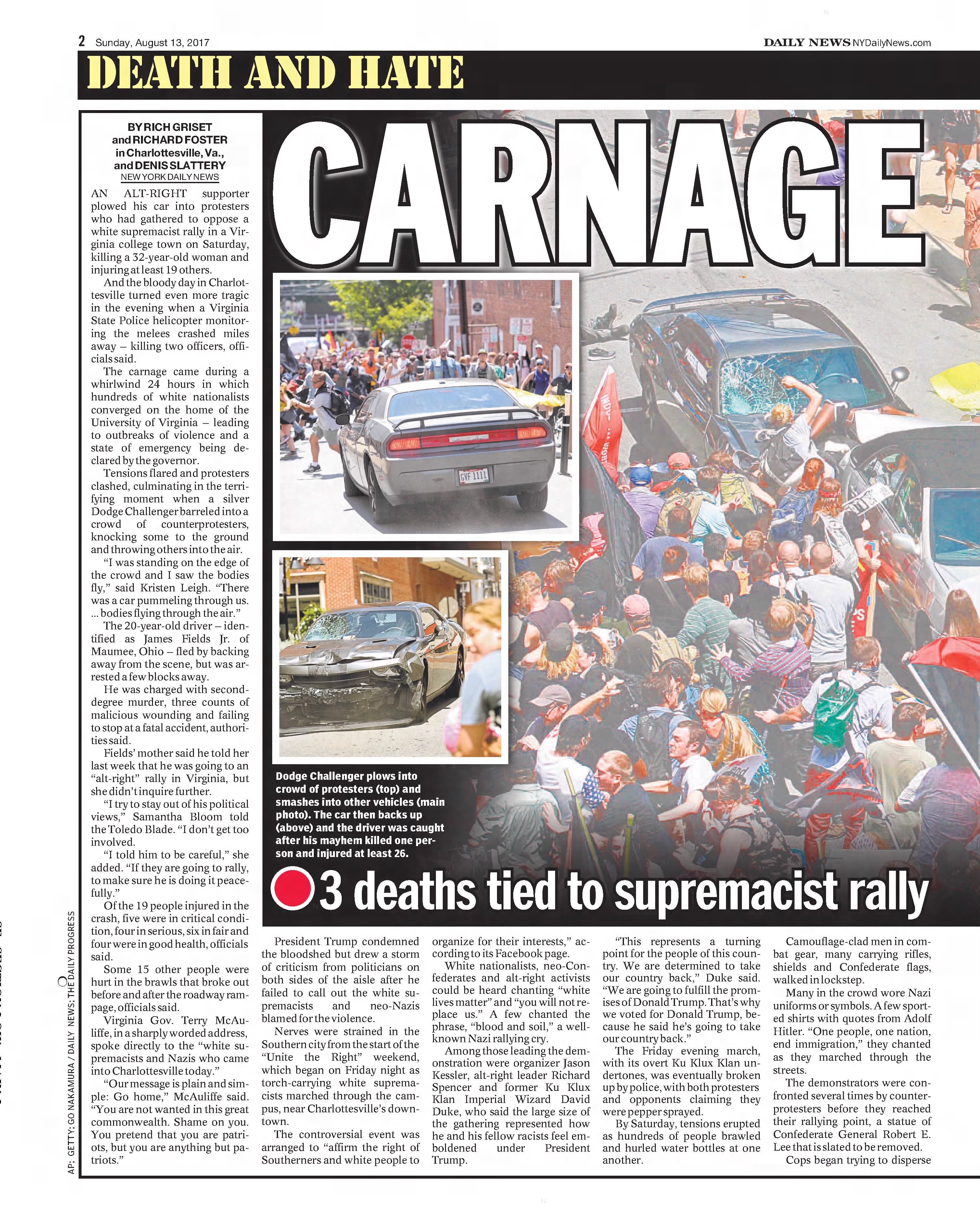 -Excerpt courtesy of the New York Daily News, “This is Trump’s America: 80 years after Hitler, simmering hate erupts,” by Mike Lupica, August 13, 2017