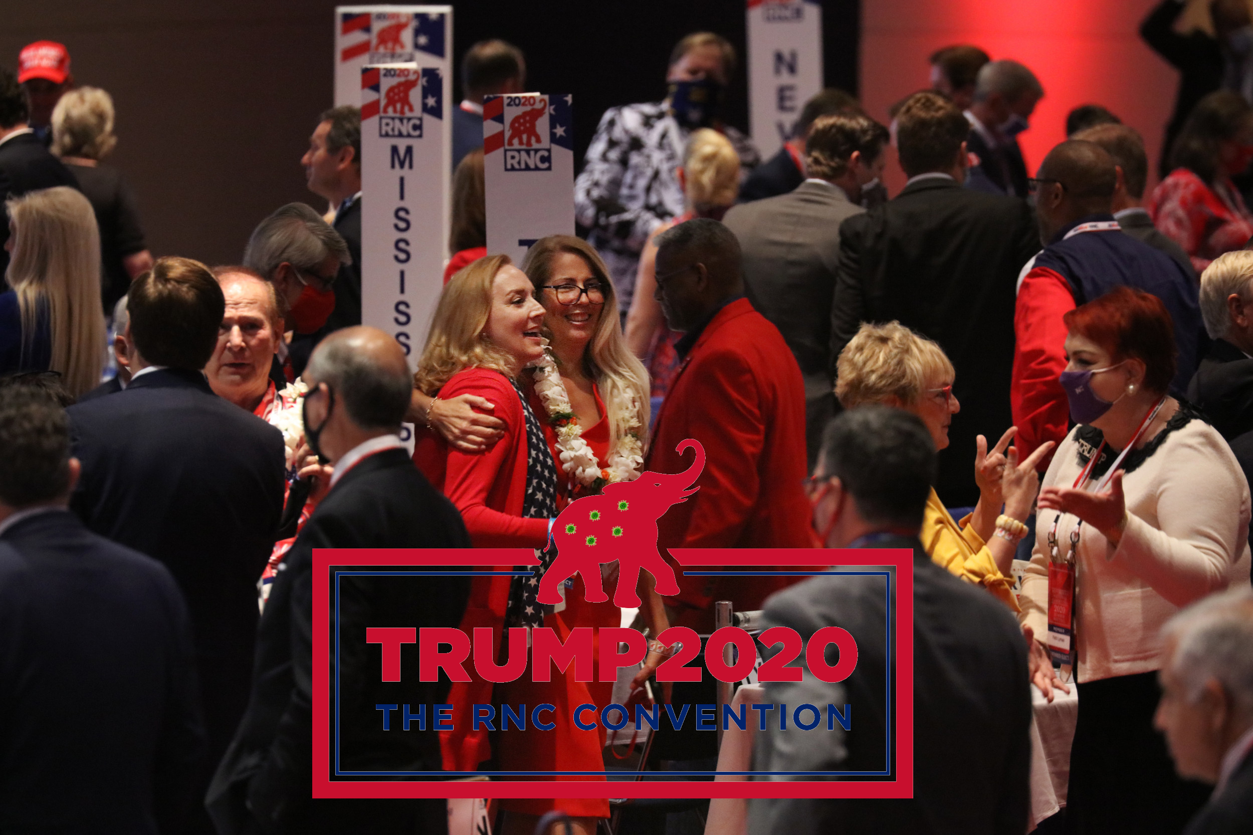But many inside were seen not wearing masks and some attendees shook hands and huddled in tight-knit circles as the RNC recessed awaiting the arrival of Vice President Mike Pence. Among delegates and convention staff, some people did wear masks. Still others did not or were seen wearing face coverings ineffectively, such as having the mask slung below their chins.