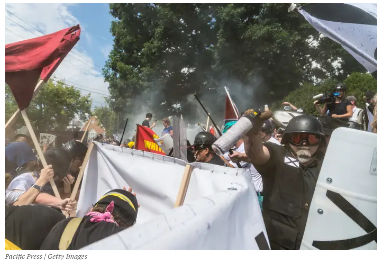 The seminal case protecting the rights of white nationalists to march in the streets is National Socialist Party of America v. Skokie, in which the Supreme Court ruled that the government could not bar neo-Nazis from marching through a Jewish neighborhood in Illinois.* Most civil libertarians (us included) believe the court got the Skokie case right. But it’s increasingly clear that Skokie can’t always help courts figure out how to deal with a post-Heller, post – “stand your ground” white nationalist protest. Whatever the courts were attempting to protect in the Skokie case wasn’t protected in Charlottesville. The marchers in Skokie didn’t promise to bring guns and armed militias to protect themselves.