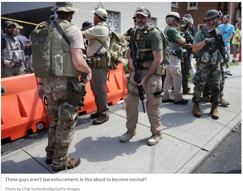 But of course, the presence of a gun itself dramatically heightens the odds that somebody is going to get shot. And, as Saturday proved, the presence of many guns, particularly the sort that can kill many people in very little time, may dissuade law enforcement from stepping in when a protest gets out of hand. The result is an alarming form of censorship: Nonviolent demonstrators lose their right to assemble and express their ideas because the police are too apprehensive to shield them from violence. The right to bear arms overrides the right to free speech. And when protesters dress like militia members and the police are confused about who is with whom, chaos is inevitable.