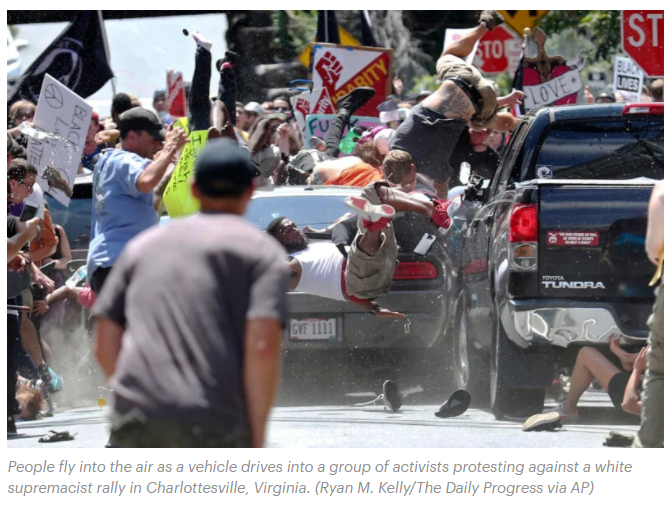 The skirmishes culminated in what appears to have been an act of domestic terrorism, with a driver ramming his car into a crowd of anti-racist activists on a busy downtown street, killing one and injuring 19 according to the latest information from city officials. Charlottesville authorities tonight reported that a 20-year-old Ohio man had been arrested and had been charged with murder.