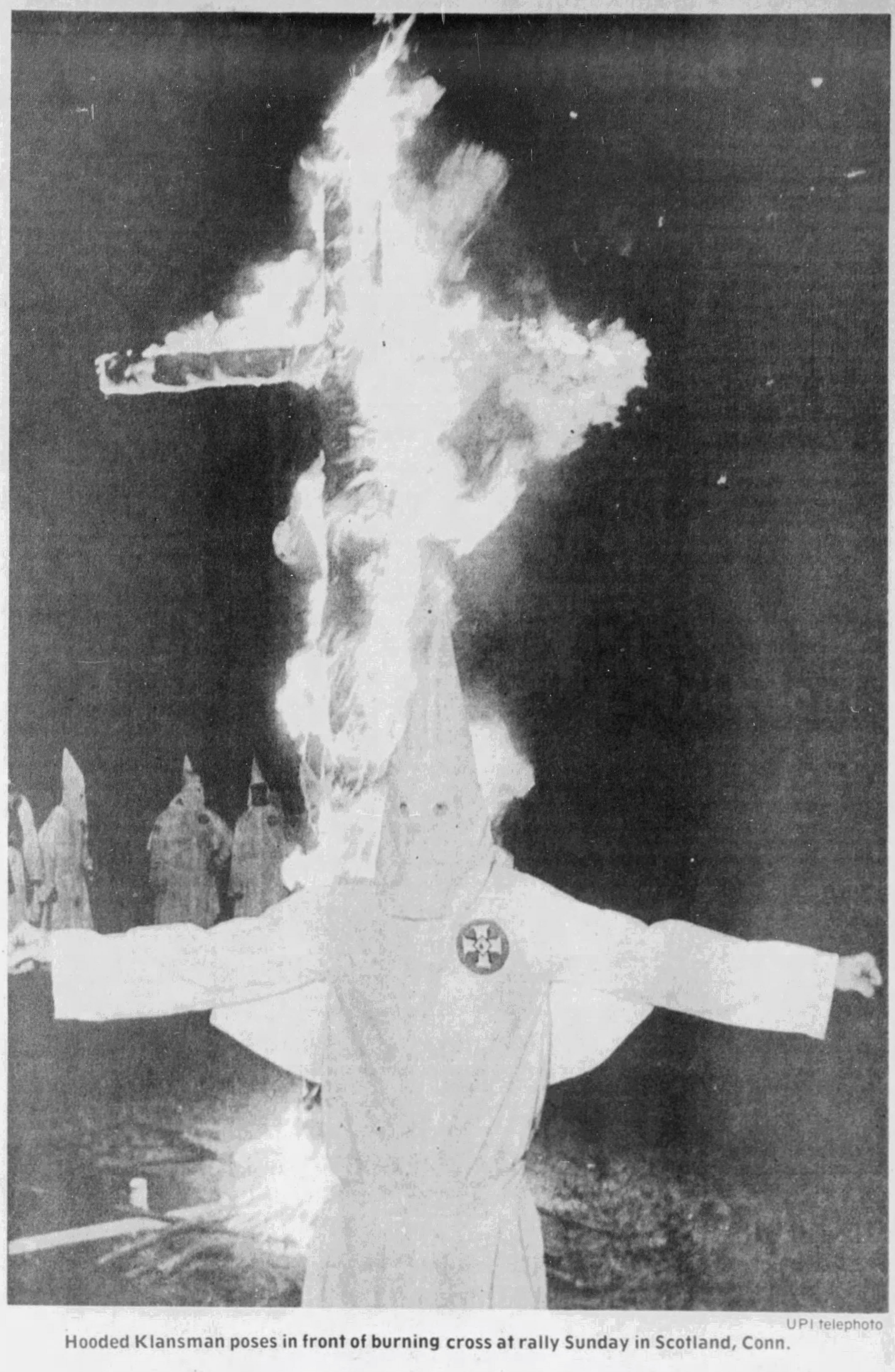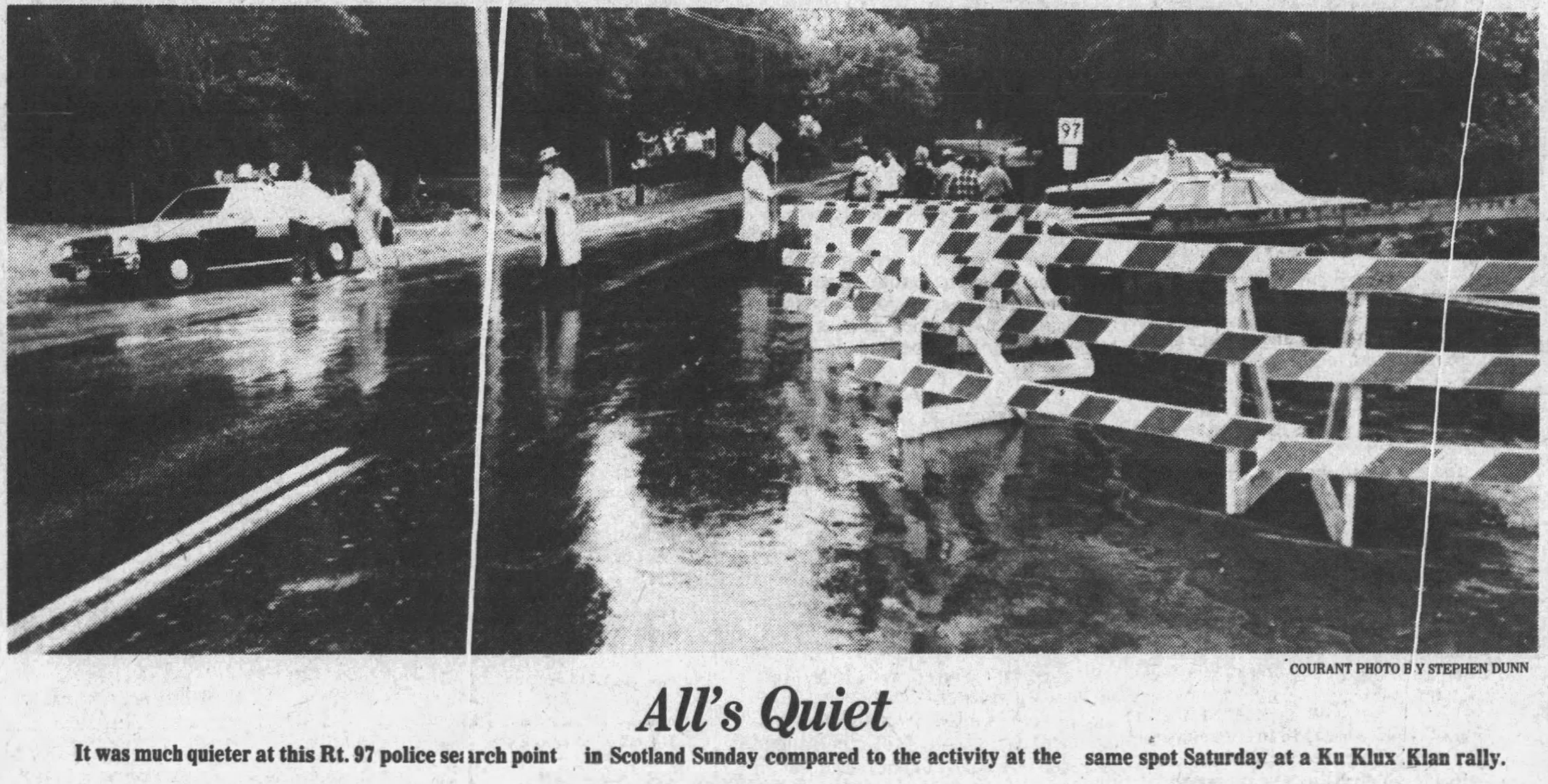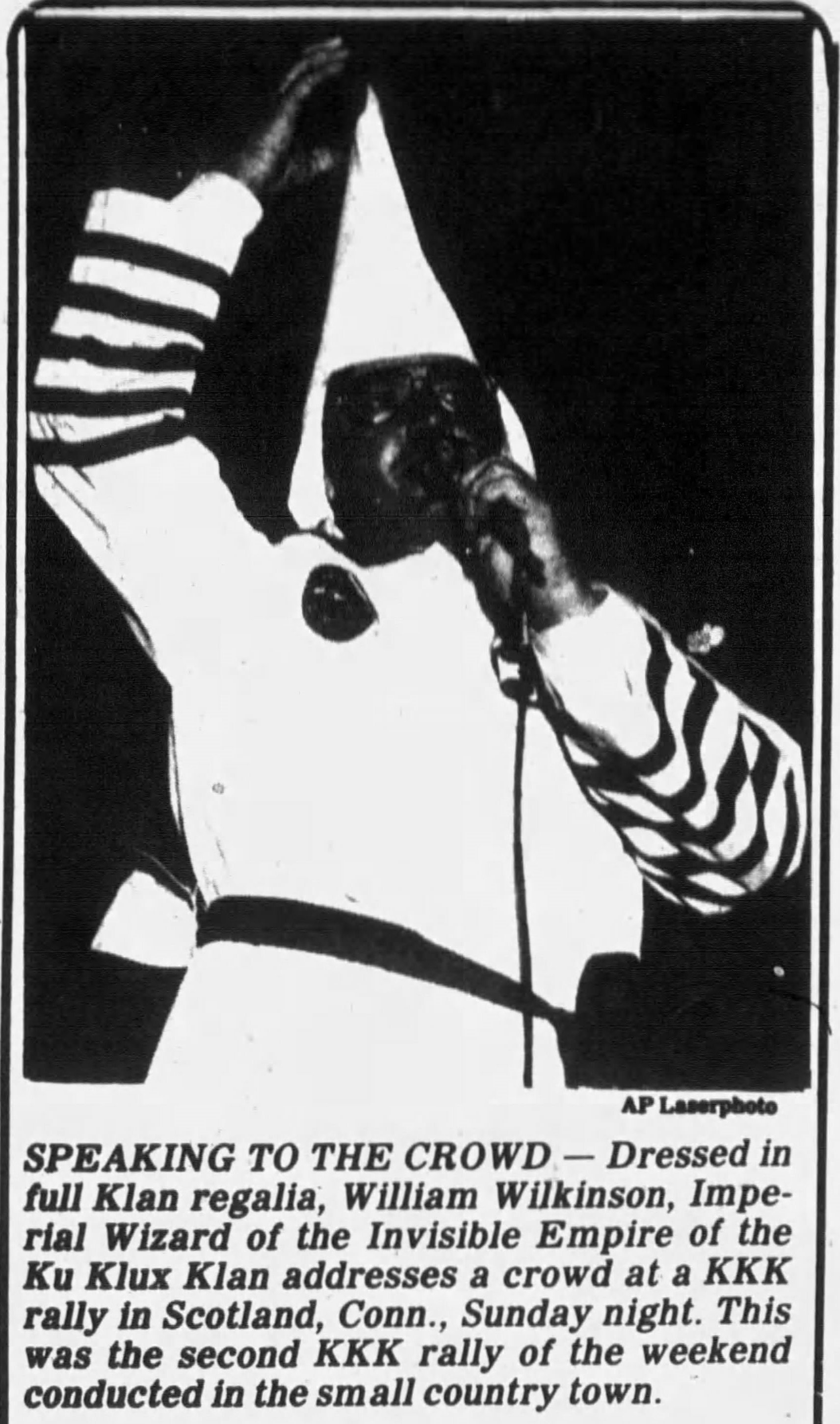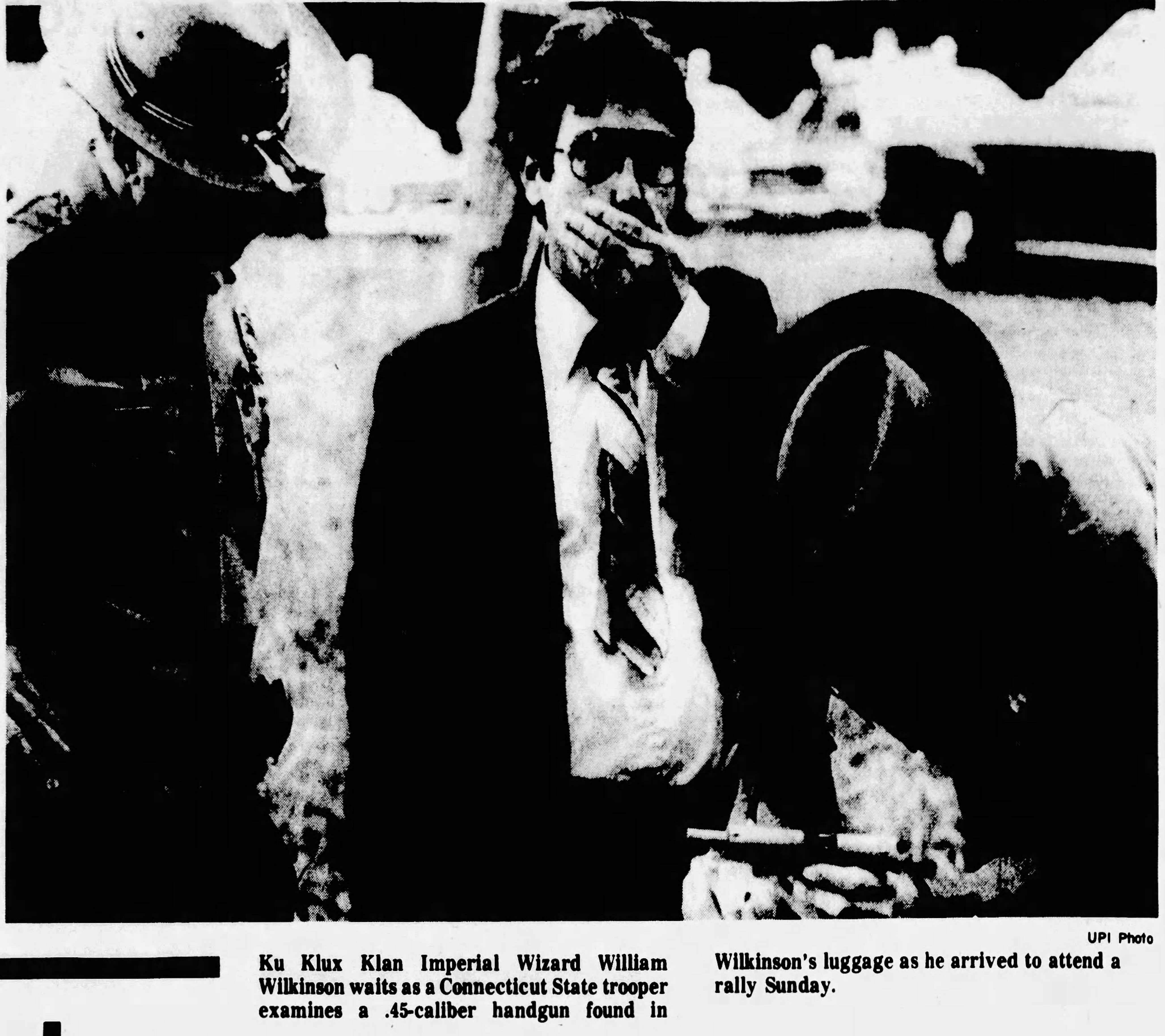KLAN’S IMPERIAL WIZARD SAYS SEGREGATION IS NATURAL — “An unofficial estimate put the cost of police protection for the two days at $150,000. There were about 200 troopers on duty throughout the weekend — many on overtime. State trooper Fred Vollono said Wilkinson was stopped in Scotland — where he led a cross-burning ceremony Saturday night — on his way to the second rally. Wilkinson at first was charged with disobeying a court order that prohibited carrying weapons in the town and of carrying a dangerous weapon in a motor vehicle. State police later dropped the first charge, saying the court order only gave them right to search cars. The charge of possession of a dangerous weapon in a motor vehicle is a felony. VOLLONO said neither Wilkinson nor the driver of the car, a Klansman, caused any problem. ‘He (Wilkinson) has been cooperative,’ Vollono said. ‘There was no incident.’ Wilkinson, imperial wizard of the Louisiana-based Invisible Empire of the Ku Klux Klan, had earlier praised 200 state troopers who patrolled the area to enforce the weapons ban. A Superior Court judge had issued the no-weapons order after Wilkinson announced the grounds would be patrolled by armed men to keep out non-whites and protesters. ‘The police did an outstanding job,’ Wilkinson said. ‘I’d hate to be in their shoes. They were very professional.’ State police searched trucks and under seats of cars and frisked some people entering the town. Klansmen carrying large tree limbs and aided by a guard dog patrolled the entrance to the field and turned back non-white reporters and demonstrators who attempted to enter the site.” — Sept. 15, 1980
