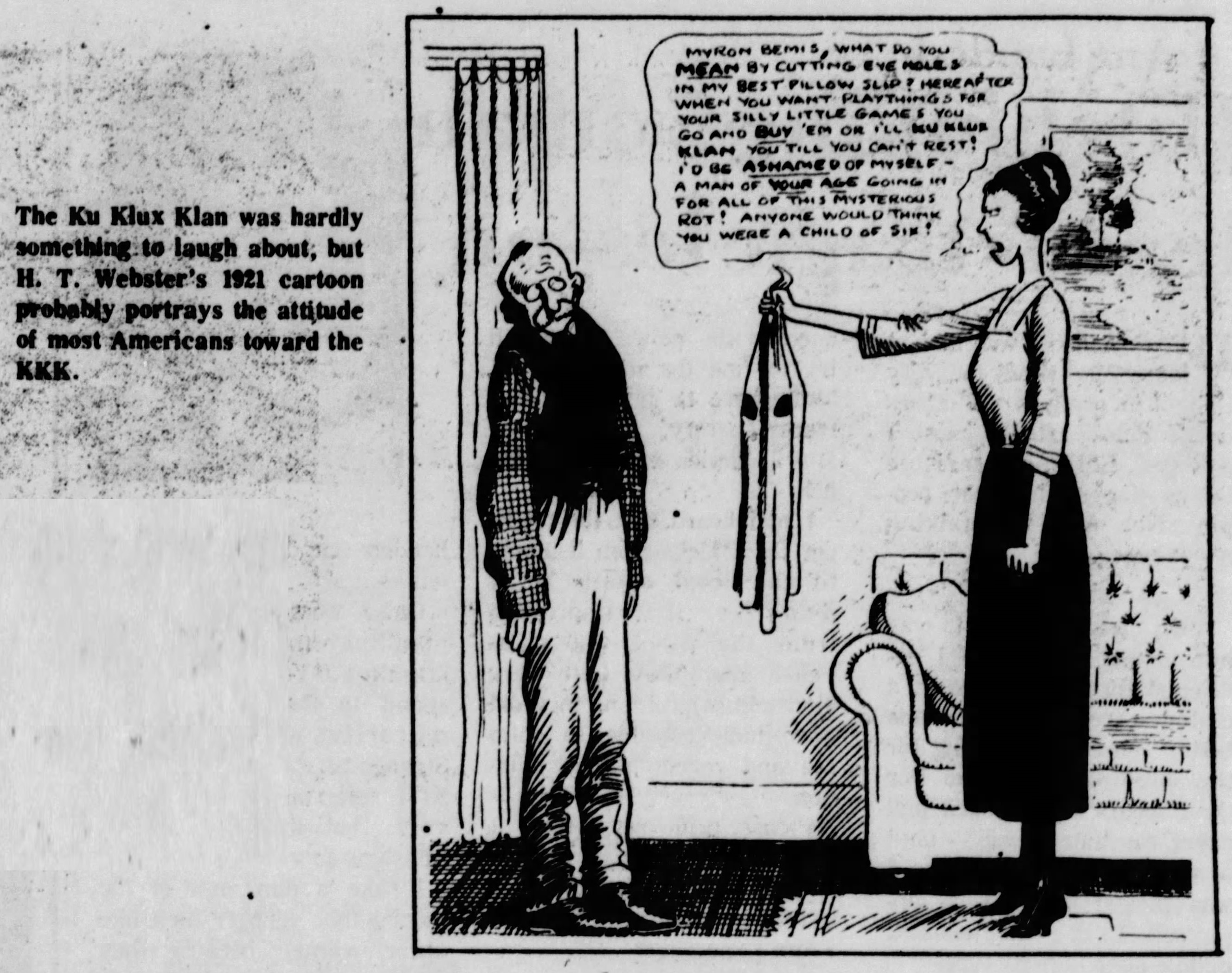 CHIEFTAIN EGGS KLAN — “Dr. Hiram W. Evans, imperial wizard, told klan members here today the time had arrived for the great moral war, with the klan on the aggressive. ‘Our organization has three main objectives,’ Evans said. ‘We seek suppression of alienism, establishment of Protestant supremacy in government and protection of American standards… Control of crime, he said, would follow Protestant ascendancy.” — Sept. 15, 1926