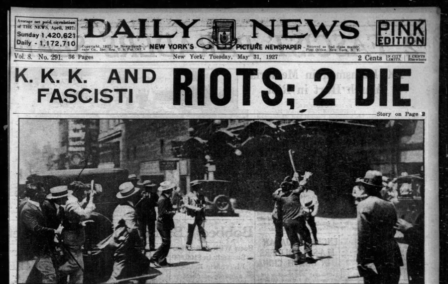 June 1, 1927 ⁠— POLICE, KLANSMEN IN RUNNING WAR: “Native-born Protestant Americans clubbed by Roman Catholic police when they exercised their rights in the country of their birth,” K.K.K. handbills declared.